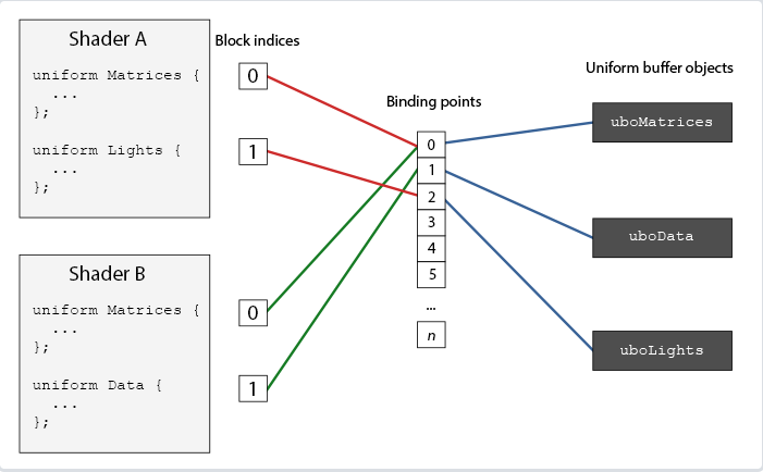 我们是通过绑定点的方式来将Uniform块和UBO缓冲结合在一起的,也即是绑定到同一个绑定点的Uniform块将拥有相同的UBO缓冲,也即拥有相同的数据
